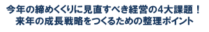 1年の締めくくりは、経営を見直す絶好のタイミングです。「売上」「資金」「人材」「承継」など、後回しになっていた課題はありませんか?いま自社の状況を整理し、来年へ向けて確かな一歩を踏み出す準備を進めるチャンスです。