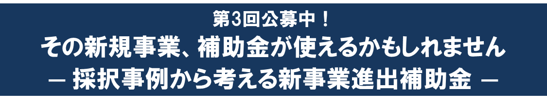 2026.2.3 第3回公募中! その新規事業、補助金が使えるかもしれません ― 採択事例から考える新事業進出補助金 ― その新規事業、補助金で実現しませんか?現在公募中の「中小企業新事業進出補助金」について、採択され やすい事業の共通点や、採択率を高めるポイントを具体的な事例と共に解説します。