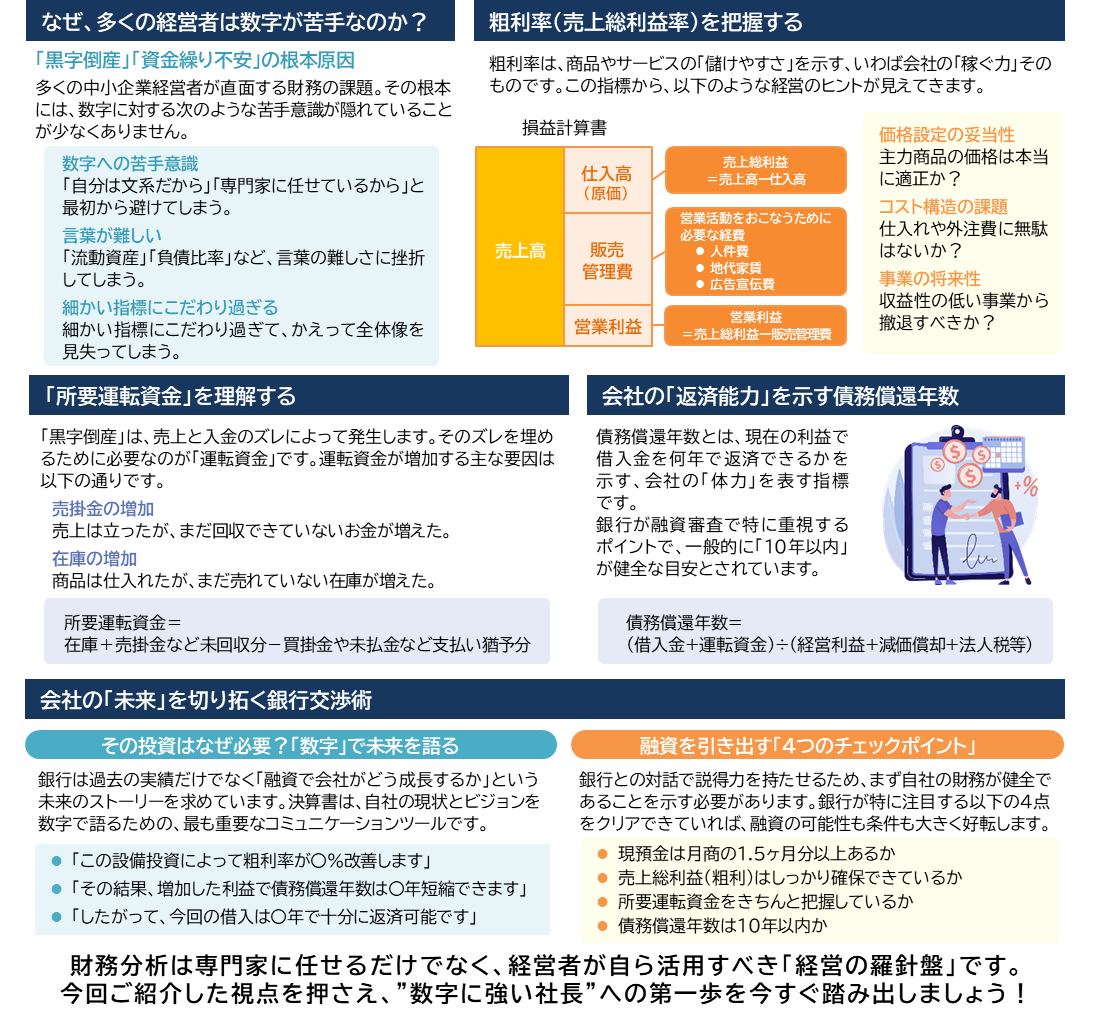2026.2.3 数字に強い社長になる! 粗利率・運転資金・融資ポイントを徹底解説 「売上は順調なのに資金繰りが苦しい…」そんな悩みはありませんか?その鍵は決算書にあります。 本NewsLetterでは、経営者が押さえるべき財務のポイントを、苦手意識を克服しながら学べるように解説します。